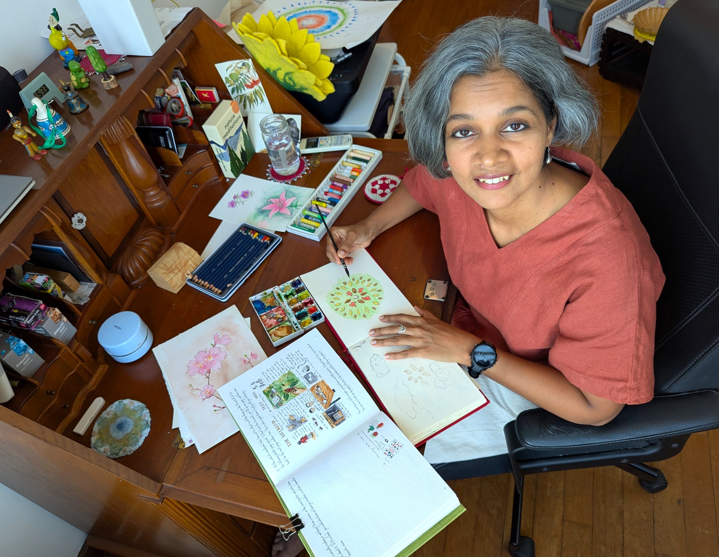 I like to say that I took the scenic route to where I am today. I trained as an engineer, spent a decade in corporate IT, and then, as a new mum juggling a full-time job, did a 100-day art project on a whim. It cracked something open. I kept drawing, eventually became a freelance illustrator, a published author, and started running art journalling workshops.